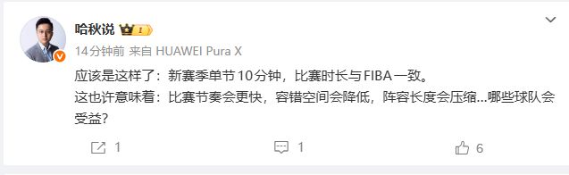 雷速体育10月29日讯 根据媒体人“哈秋说”透露,新赛季CBA联赛为单节10分钟,比赛时长与FIBA比赛一致。哈秋说:应该是这样了:新赛季单节10分钟,比赛时长与FIBA一致。这也许意味着:比赛节奏会更快,容错空间会降低,阵容长度会压缩…哪些球队会受益?