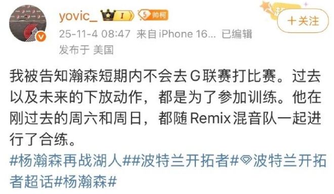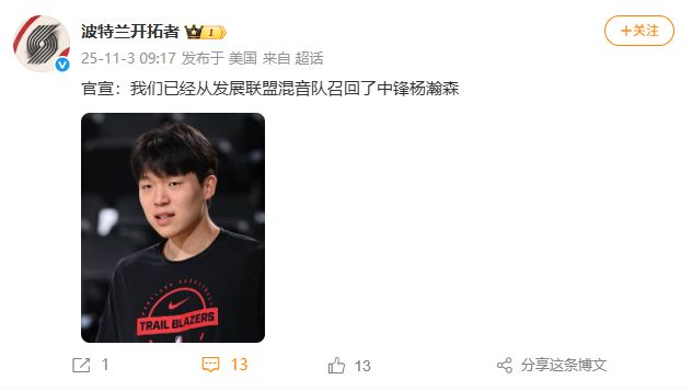 随后,杨瀚森工作室更新社媒发声:“为增强竞技能力,尽快适应NBA高强度的比赛水平,杨瀚森将于即日起,除参加开拓者队日常比赛及训练外,还会参加下属发展联盟球队的日常训练,以此加大训练量,增强体能储备的同时打磨个人技术。”工作室表示:“关心小杨训练情况的朋友们,可以多多关注球队的官方账号。感谢球迷一直以来对瀚森的关心、督促与建议,也希望能给这个年轻人再多一点时间。最重要的不是过去,而是整个漫长赛季的征途。”11月3日,@波特兰开拓者 官宣:我们已经从发展联盟混音队召回了中锋杨瀚森。