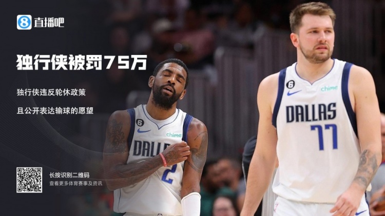 今年4月份,NBA宣布,独行侠因在4月8日同公牛的关键战中有对联盟不利的行为被罚款75万美元,他们违反了联盟的球员轮休政策,并通过行动和公开声明表明了球队故意输球的愿望,以提高在2023年保住自己首轮签的机会。