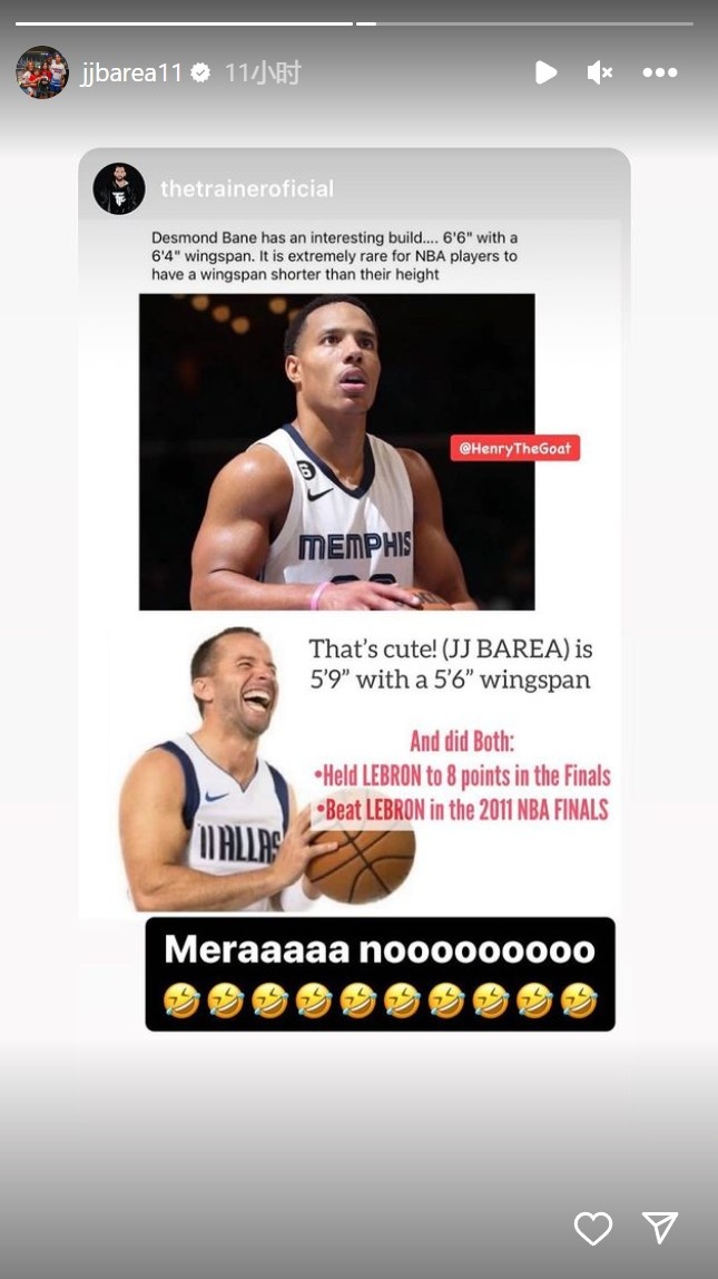 8月17日讯 今天,独行侠名宿JJ-巴里亚更新了Instagram story,转发了一位媒体人的帖子。